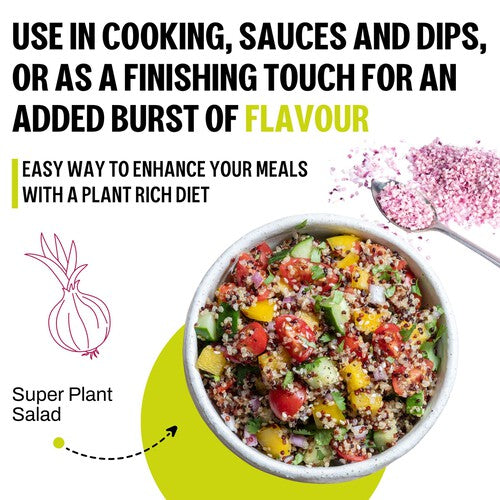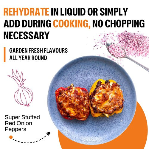JUX Red Onion pieces offer a convenient shortcut to flavourful meals without the prep work or tears associated with fresh onions. These perfectly diced pieces are freeze-dried to maintain their colour, flavour, and nutrients. They function as a direct replacement for fresh red onion in nearly all your favourite recipes.