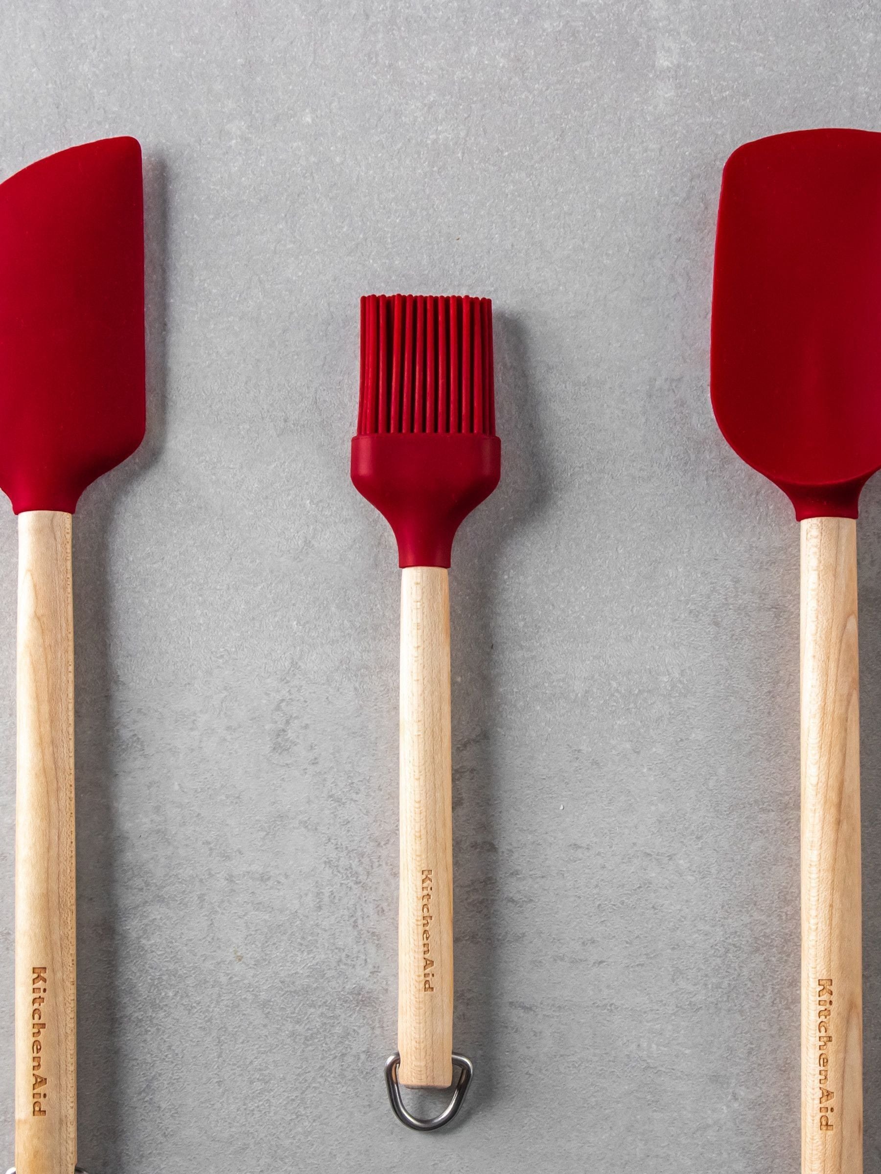 This KitchenAid 3pc Birchwood Baking Set includes a pastry brush, a spoon spatula, and a mixer spatula, all with stainless steel hanging hooks. The silicone spatula's durable head is heat-resistant to 260 °C/500 °F.