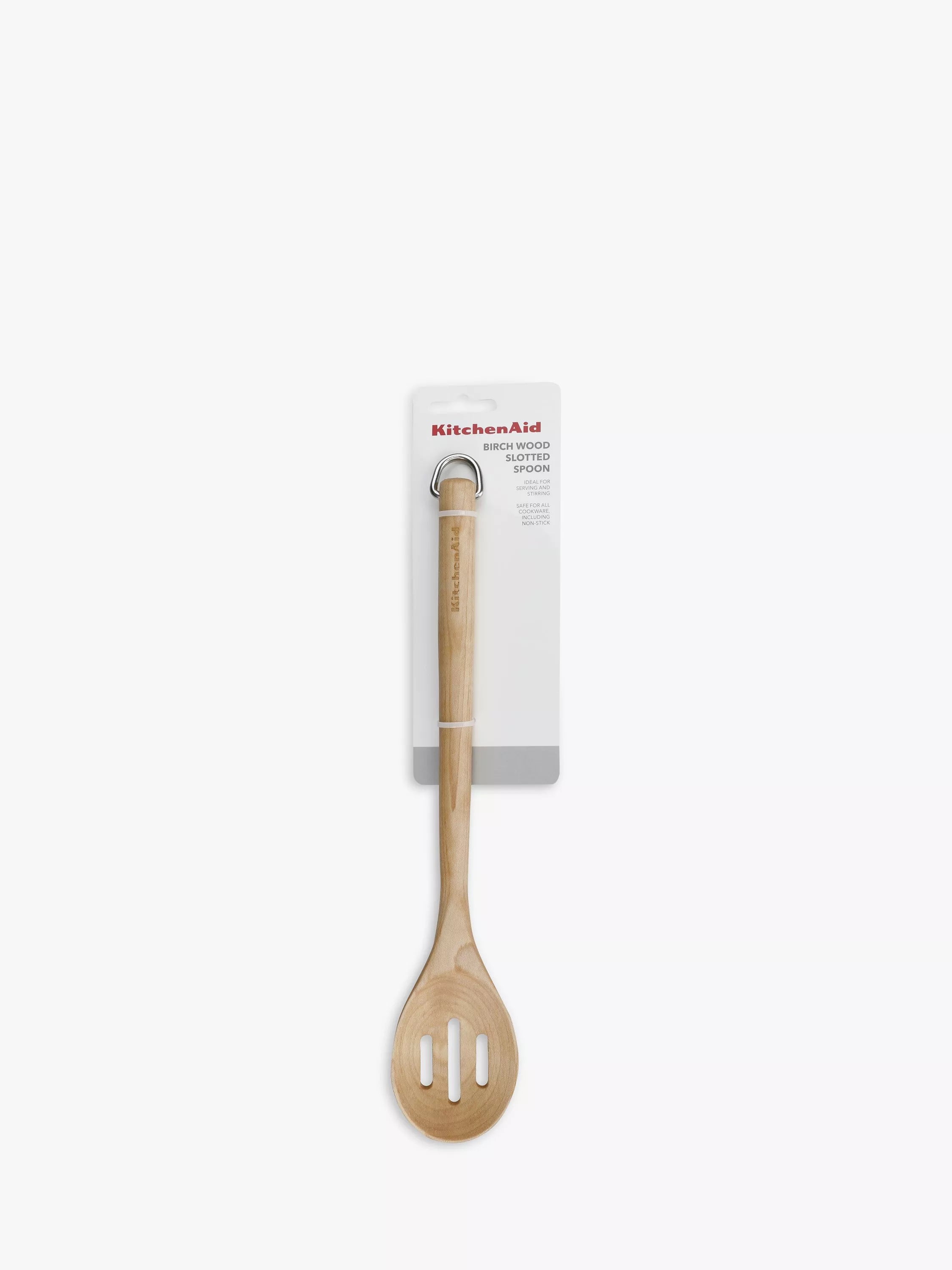 This KitchenAid Birch Slotted Spoon is great for stirring soups and serving vegetables straight from a pan. Made of durable birch wood, it's safe for use on all cookware, including non-stick. It features a stainless steel hanging hook on the handle.