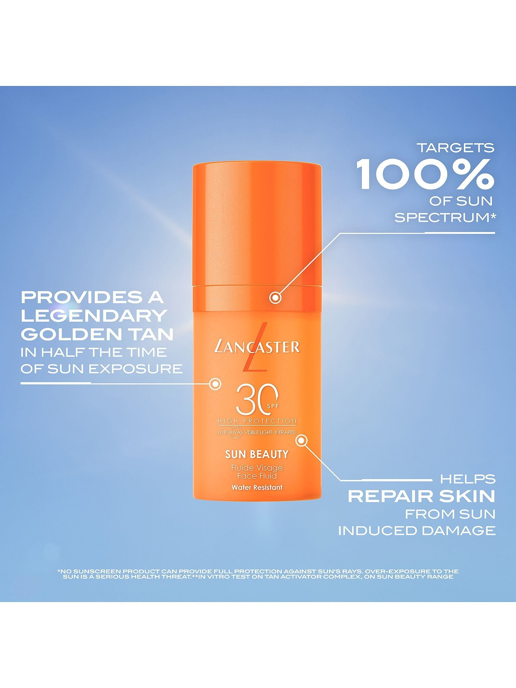 The Lancaster Sun Beauty Face Fluid SPF30 is your ultimate photoaging protection ally. Our Full Light Technology TM, offers 10x broader sun spectrum technology while our Tan Activator complex provides a legendary golden tan in half the time of sun exposure. Ultra-lightweight and non-greasy, this face fluid instantly melts into the skin, leaving an invisible, silky smooth, dry-touch finish and a bare-skin sensation. By targeting the Full Sun Spectrum vs UVB & UVA protection only. No sunscreen product can provide full protection from sun's rays. Overexposure to the sun is a serious health threat.