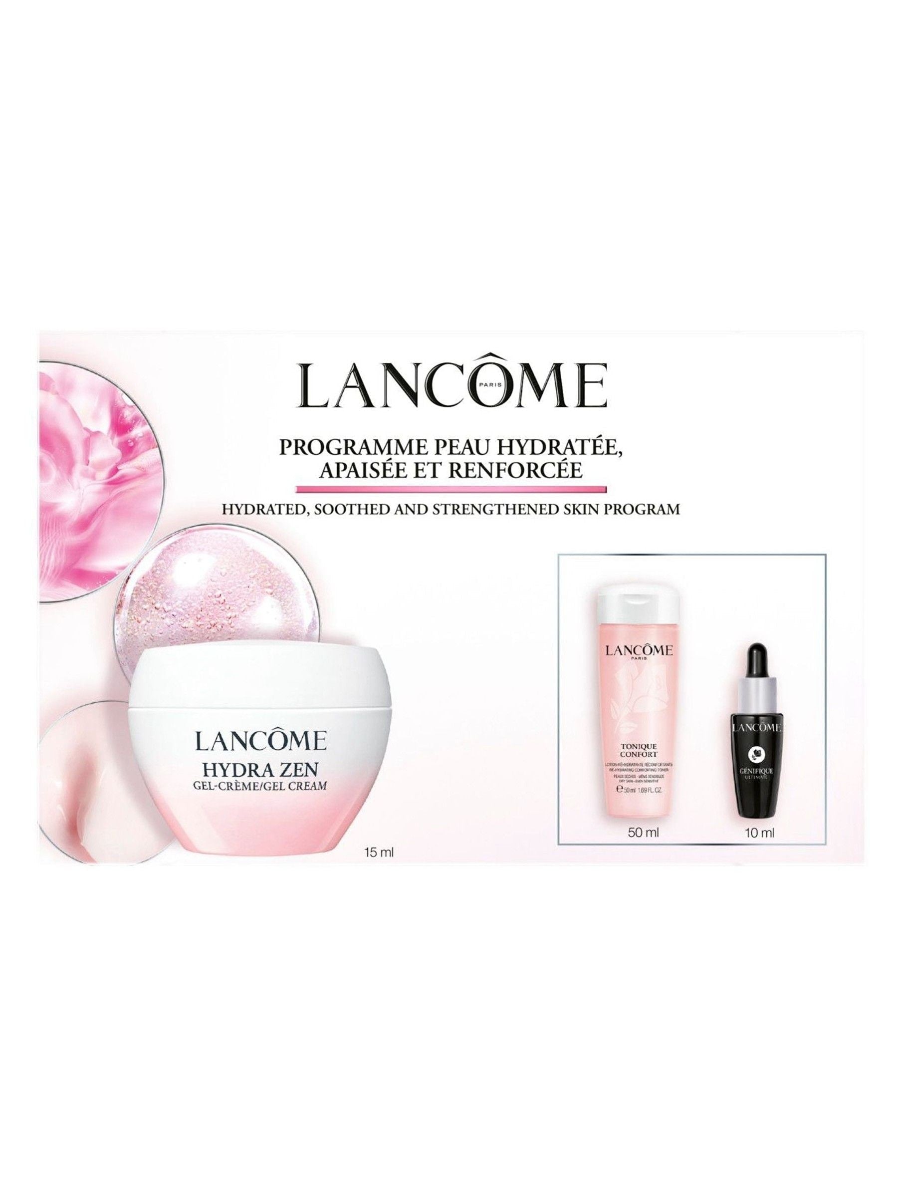 A skincare set containing a complete day routine with the new formulas of our iconic lotion, face serum and day cream to get hydrated, soothed and strengthened skin. STEP 1: Tonique Confort 50mlBold make-up, lack of sleep, packed agenda, stress, hectic life… Your skin can feel overstrained and becomes dull. Our iconic ‘big pink’ lotion is our ultimate hydrating and comforting post-cleanse product. Enriched with Acacia Honey and Sweet Almond Oil, it removes any remaining impurities left over from cleansing and leaves the skin fresh, hydrated and comforted. STEP 2: Génifique Ultimate Serum 10mlNew Génifique Ultimate Serum is powered with Beta Glucan-CM technology, known to accelerate skin repair. Combined with Hyaluronic Acid, Licorice Extract and our iconic pre-& probiotic fractions, this formula offers the ultimate repair solution, targeting the appearance of redness, fine lines and smoother skin. Ultimate results on overall skin quality, skin barrier repair and early signs of aging: 28% fine lines, +22% smoothness, -33% redness**STEP 3: Hydra Zen Gel Cream 15mlHydra Zen Gel Cream, our iconic hydro-soothing treatment, is now infused with a natural-origin Centifolia rose extract and powered by biotech hydro-active Hyaluronic Acid and soothing Bisabolol. This lightweight gel cream provides a 72h lasting hydration and perceived efficacy on redness reduction after only 1 week. Instrumental test, 28 women. Self-assessment, 170 women, 1 weekInspired by derm-hydration treatment, Hydra Zen Gel Cream goes beyond hydration to strengthen skin barrier and reduce skin sensitivity. With this skincare routine, discover: Repaired and younger-looking skin-Reinforced, hydrated and soothed skin. Contains: Tonique Confort new formula, Hydra Zen Gel Cream new formula and new Génifique Ultimate Serum for augmented results on hydration, soothing and skin barrier repair. New Hydra Zen Gel Cream provides a 72h lasting hydration and perceived efficacy on redness reduction after only 1 week. Instrumental test, 28 women. Self-assessment, 170 women, 1 weekInspired by derm-hydration treatment, Hydra Zen Gel Cream goes beyond hydration to strengthen skin barrier and reduce skin sensitivity. 1 SECOND TO VISIBLY SOOTHE SKIN 152% INSTANT MOISTURE RECHARGE. UP TO 10 LAYERS. 72H LASTING HYDRATION. 22% REDNESS****9 OUT OF 10 WOMEN HAVE A SENSATION OF WELLNESS IMMEDIATELY AFTER USE. Self-assessment, 170 women, instantly after use. Instrumental test, 28 women***superficial layers of the epidermis. Clinical scoring, 79 women, 4 weeks. Proven efficacy on all skin types. Tested on sensitive skin.