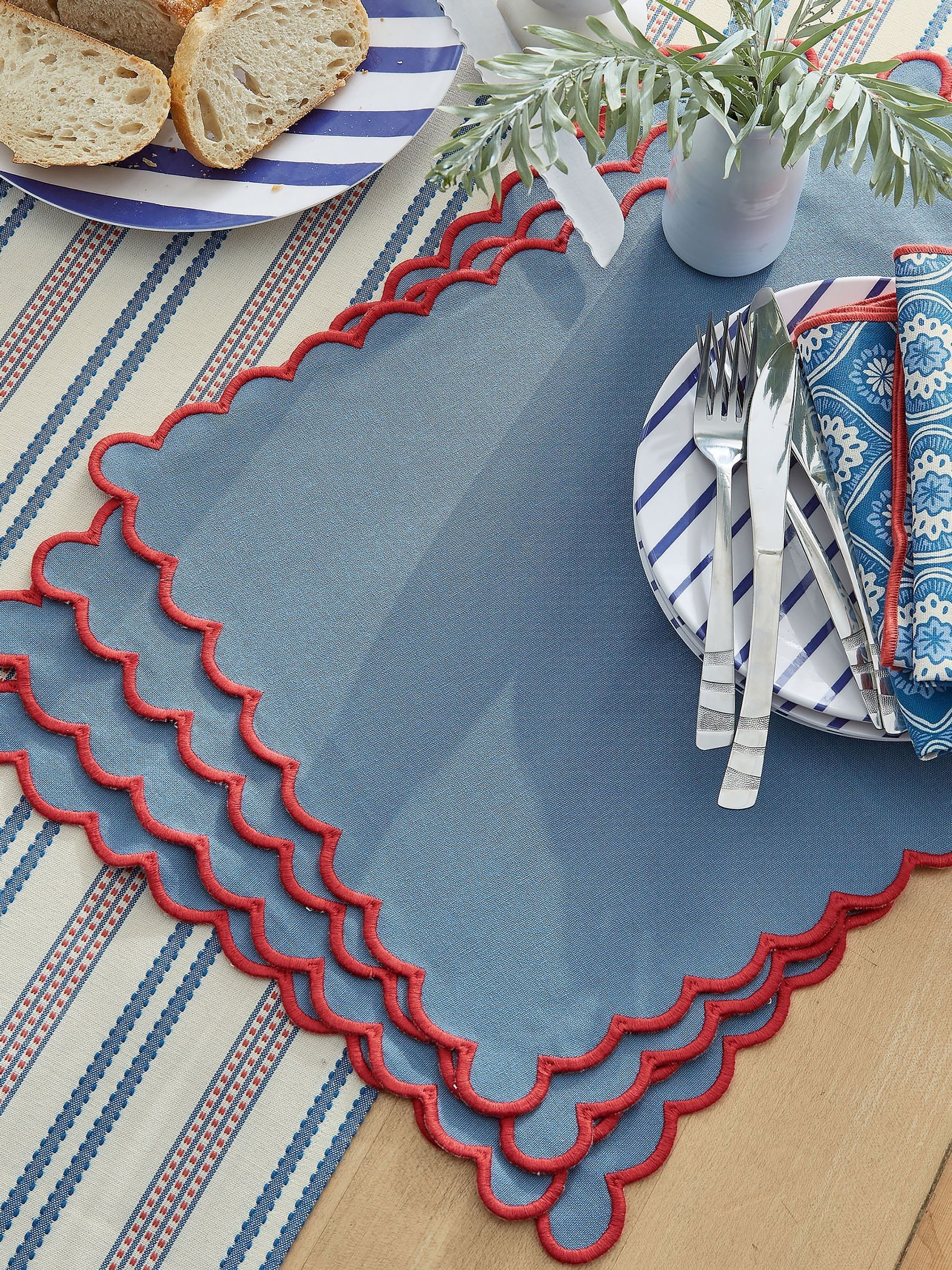 Plain blue placemat pair with a scalloped edge all round trimmed with red. Read More