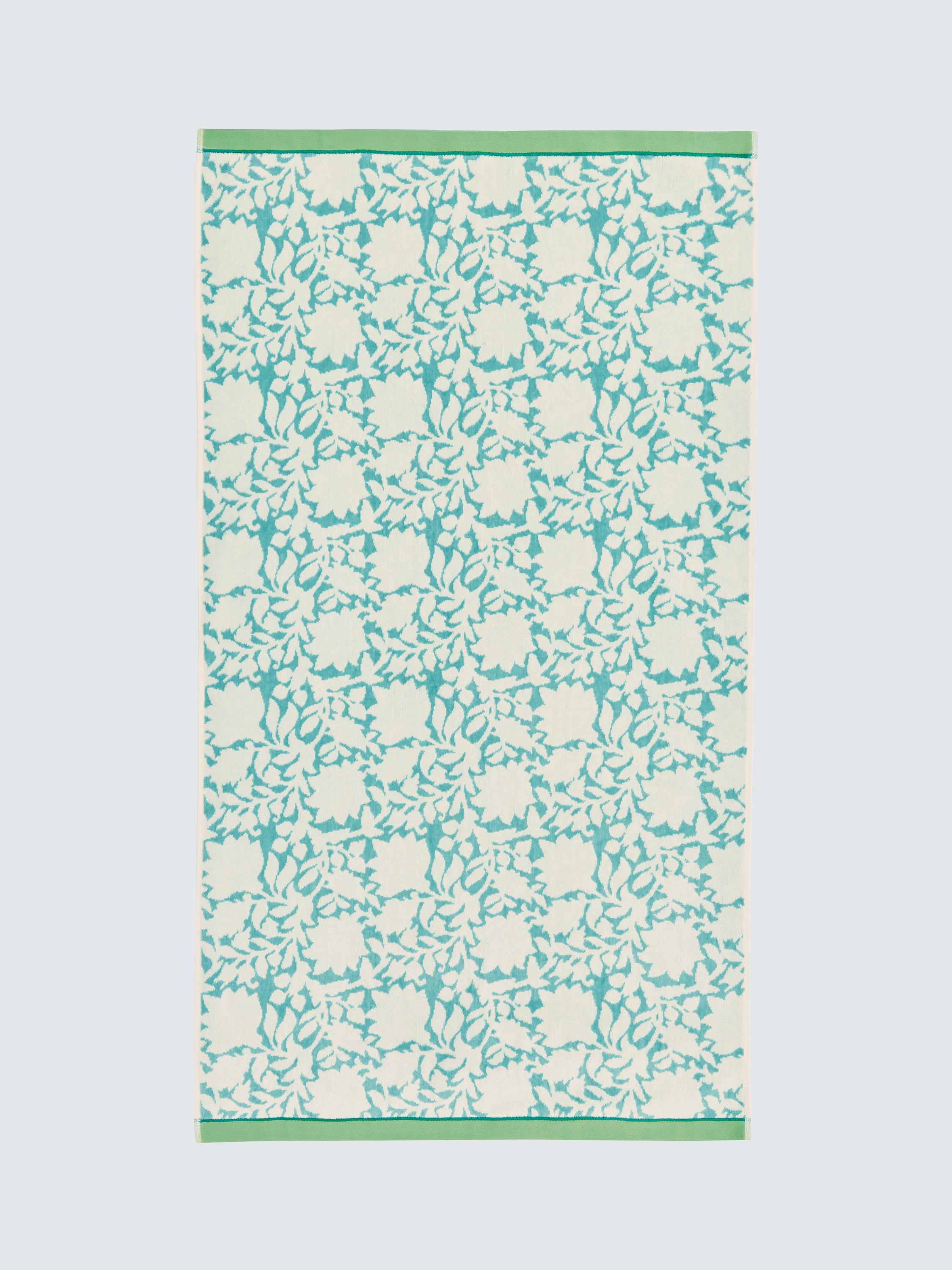 Read MoreA bold floral towel in striking blue trimmed with a red and green hem to the top and bottom.
