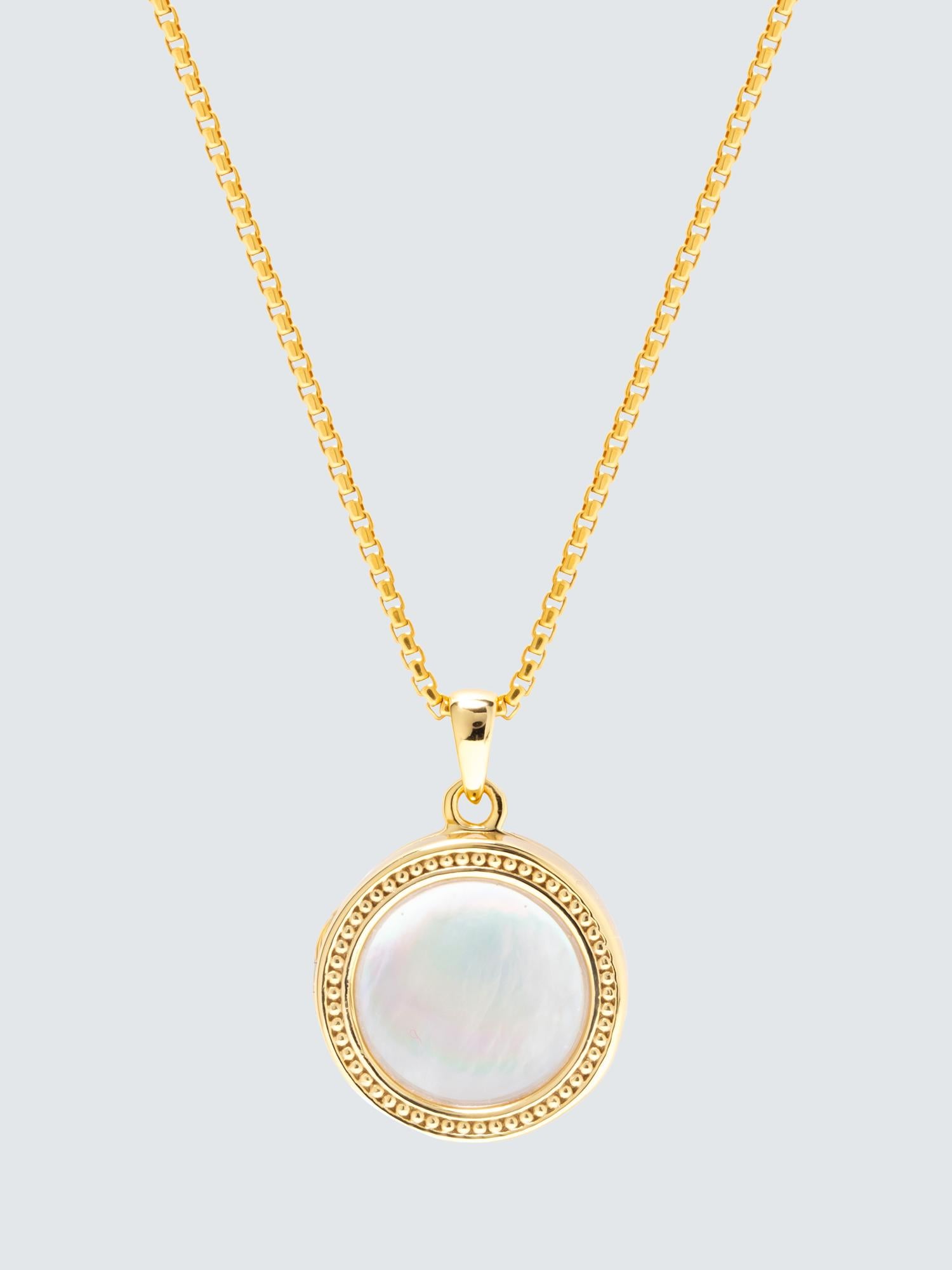 The mother-of-pearl disc is set into a 18ct gold plated case with the iconic "Lombok" texture. This locket can be worn solo as a statement piece, or paired with other styles to create a stack.