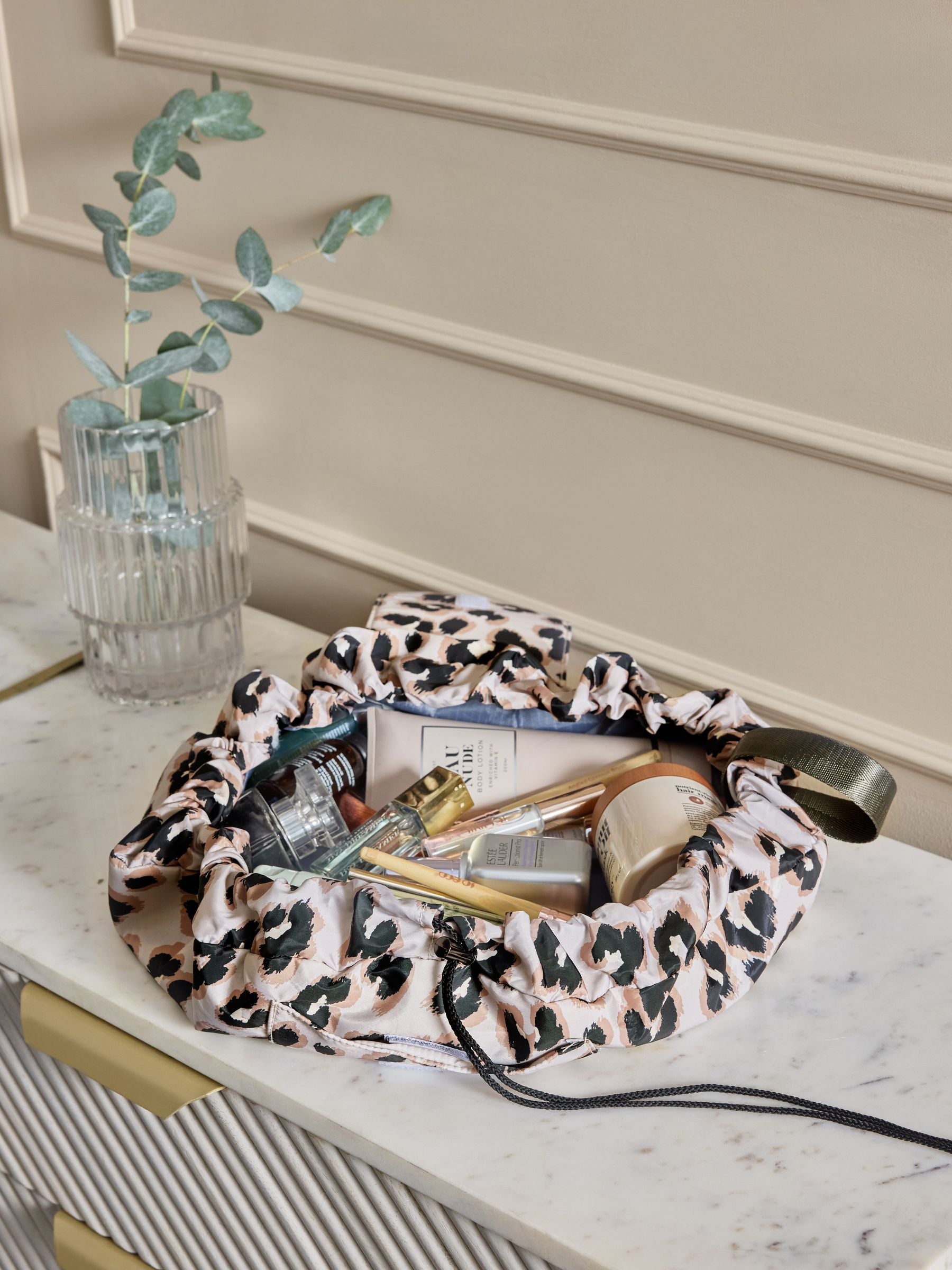 This lay-flat style make-up bag folds flat in a matter of seconds, letting you see all of your cosmetics in an instant! It also has handy outer pockets for those easy-to-reach items when fully closed. The drawstring lets you close and transport your make-up essentials quickly and easily.
