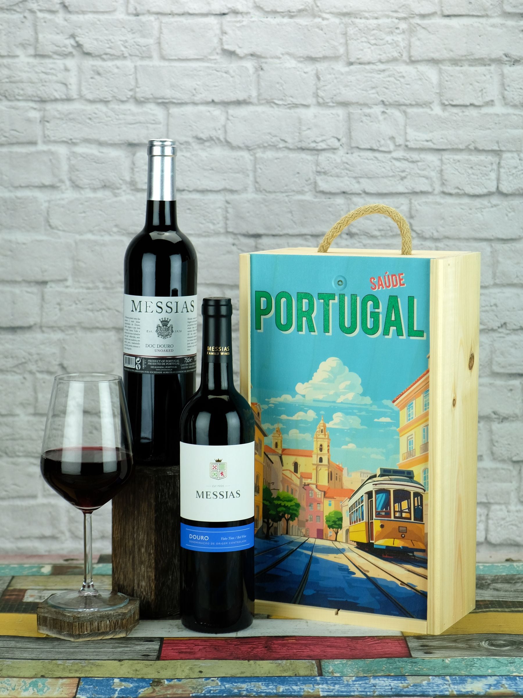 Explore the taste of Portugal with this duo of red wines. Featuring two red wines from the Messias Estate presented in the pictured wooden gift box. The Messias Tinto is ruby in colour with characteristics of dry fruit notes with an agreeable after taste. The Douro Unoaked wine is an intense colour with violet nuances and the fragrant aromas highlight notes of blackberry. The palate is intense and fresh with youth tamed by the maturity of the grapes. Contents: Messias Selection Tinto 750ml - 13.0% ABV / Messias Douro Unoaked 750ml - 13.0% ABV. Wine glass not included. If any wines are unavailable a suitable replacement will be substituted.