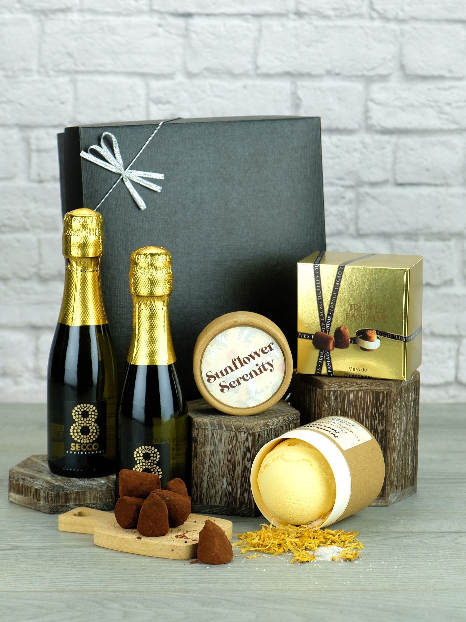 The gift with everything you need to unwind in the tub and forget about your stress. Two single serve bottles of fine and delicate Prosecco, a box of Marc de Champagne truffles and a relaxing aromatic bath bomb. Contents: 8 Secco Prosecco 2x 200ml - 11.0% ABV / Marc de Champagne truffles 100g / Bath Bomb 170g If any items are unavailable a suitable replacement will be substituted.