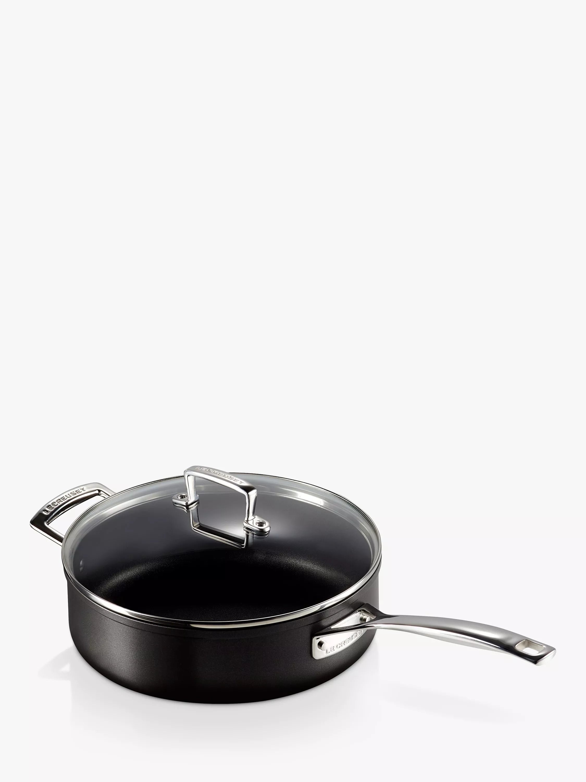 A saute pan and lid from Le Creuset's Toughened Non-Stick cookware range, with a wide base and roomy straight sides and all the benefits of a frying pan and casserole in one pan. It's ideal for quick, light frying, searing meat and reducing sauces. The high sides prevent splattering or spilling and the lid allows food to cook slowly.