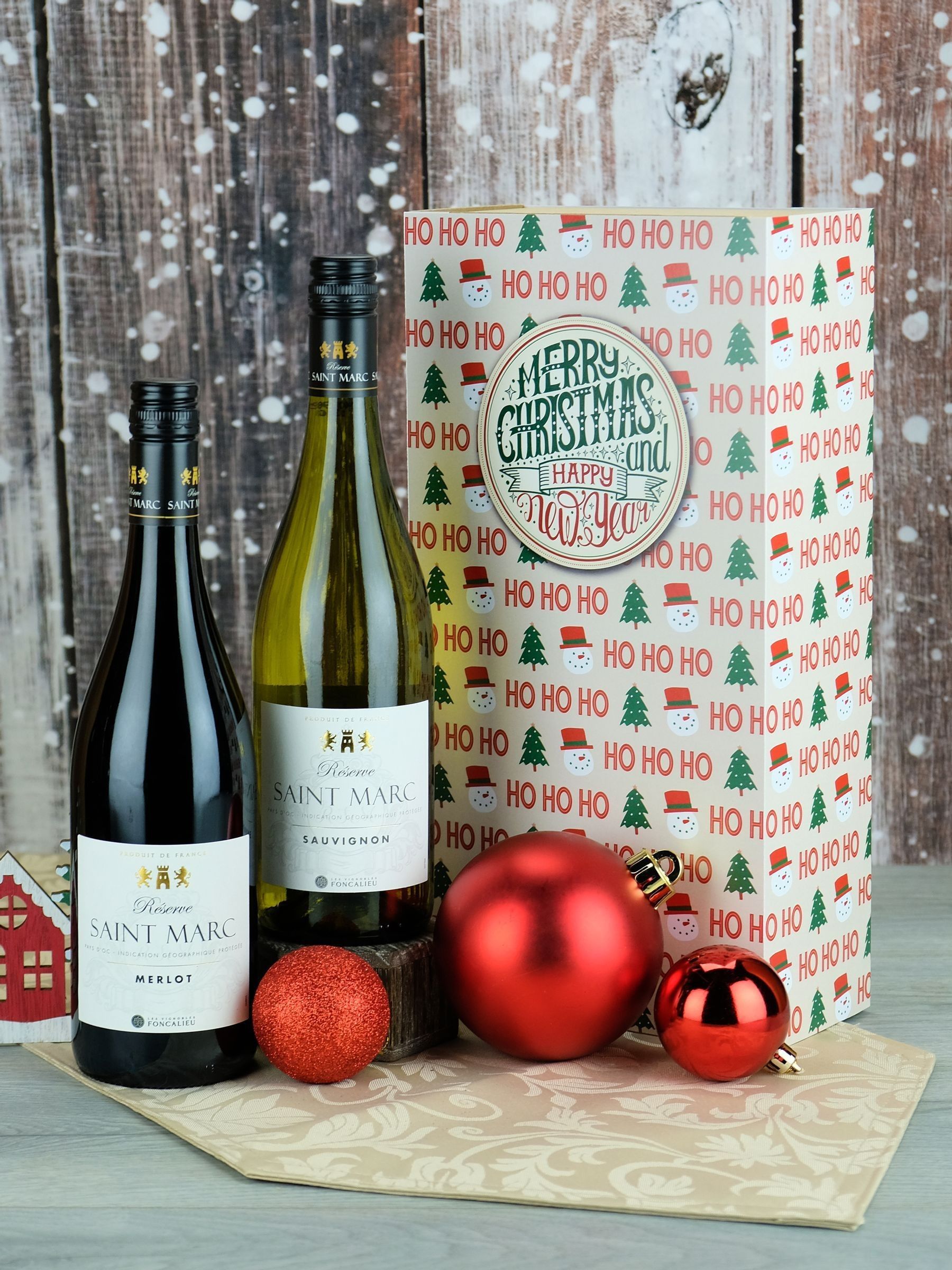 Ho Ho Ho and Merry Christmas! Treat some one a a wine gift this Christmas. The Xmas themed sleeve-wrapped gift box features a refreshing French Reserve Sauvignon Blanc and an easy drinking Merlot from Saint Marc. Contents: Saint Marc Merlot 750ml - 13.0% ABV / Saint Marc Sauvignon Blanc 750ml - 12.0% ABV. If any wines are unavailable a suitable replacement will be substituted.