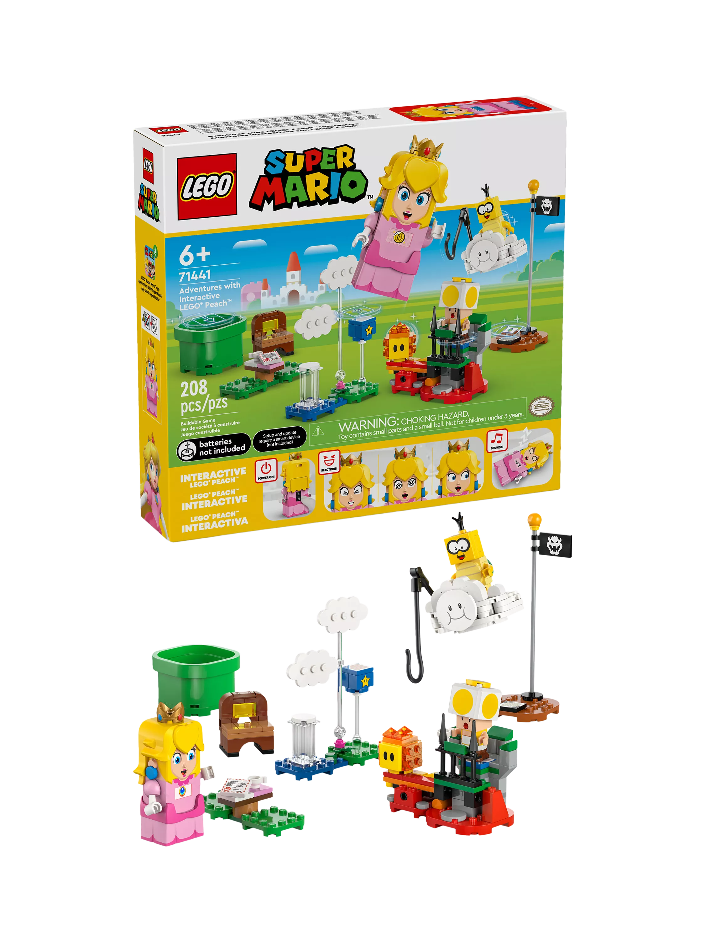 Join an iconic Super Mario™ character for a picnic and fly on a cloud to rescue the Yellow Toad with the Adventures with Interactive LEGO® Peach™ princess toy playset for kids (71441). A top Nintendo® gift for girls, boys and gamers aged 6 and over, the set features an interactive LEGO Peach figure, plus Lakitu, a Yellow Toad and a Lava Bubble. Travel from the Start Pipe to the Goal Pole triggering digital reactions from LEGO Peach and collecting coins along the way. Have a picnic, read a letter saying that the Yellow Toad has been captured, topple Lakitu from the cloud, and fly, flip and loop the loop on the cloud on the way to rescue the Yellow Toad.