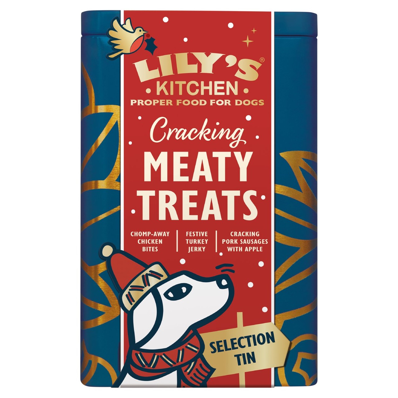 This festive tin from Lily's Kitchen contains a selection of three different baked treats for your dog. It is designed to complement the holiday celebrations, offering a special reward after outdoor activities or relaxing indoors. The decorative tin itself can be kept and reused for the following Christmas season.