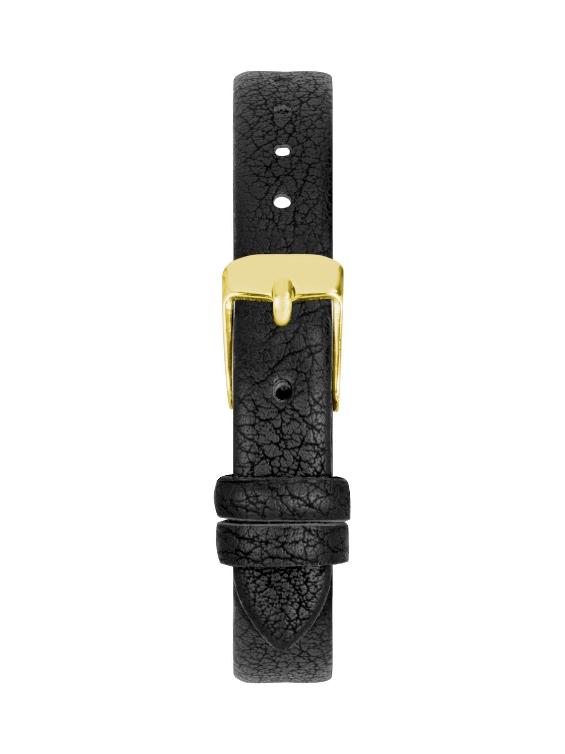 This watch features a rectangular, gold plated case housing a cream dial with printed gold figures. Fastened with a black PU strap with a gold plated buckle.