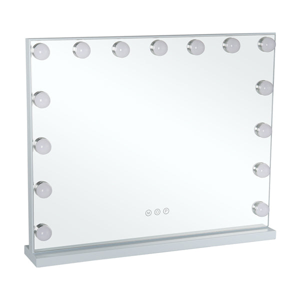 nonslip base provides safety and stability on your table placement customize lighting with a choice of three different shades touch sensor switches with fast response time specifications dimensions 58cm w x 46cm h mount type freestanding mirror type makeup shape rectangle frame material iron colour white power source plugin plug included yes lighting included yes number of bulbs 15 dimmable lighting yes switch type touch control package content 1 x led lighted mirror 1 x plug package specifications package dimensions wxdxh 645 x 205 x 56cm gross weight 6kg