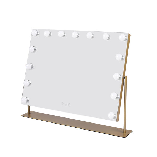 adjustable brightness and three distinct lighting modes tailored to your preferences 15 led bulbs provide ample light for your various requirements and illuminate your space effectively the mirror can be easily adjusted for finding the best angle specifications dimensions 65cm w x 10cm d x 50cm h mount type freestanding mirror type makeup shape rectangle frame material iron colour gold power source plugin plug included yes lighting included yes dimmable lighting yes number of bulbs 15 package content 1 x led lighted mirror 1 x plug package specifications package dimensions wxdxh 705 x 565 x 185cm gross weight 69kg