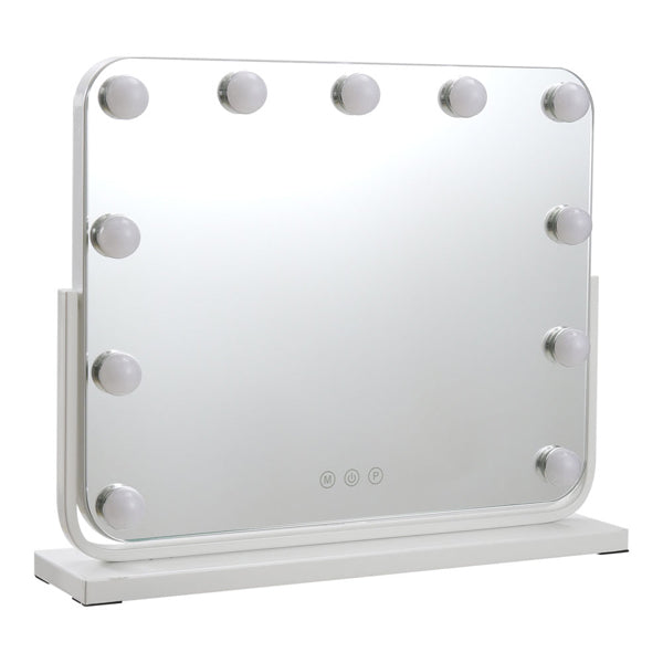 Contemporary frameless design with rounded edges 11 dimmable LED bulbs let you customize the lighting User-friendly touch panel for effortless light control Rotation mirror for flexible viewing angles Sturdy metal base guarantees stability and durability Overall Dimension: 50cm W x 12cm D x 40cm H Mirror Dimensions: 47cm W x 3cm D x 38cm H Base Dimensions: 50cm W x 12cm D x 2cm H Mount Type: Freestanding Material: Glass+MDF+Metal Power Source: Plug-in Plug Included: Yes Lighting Included: Yes Bulbs Included: Yes Number of Bulbs: 11 Dimmable Lighting: Yes