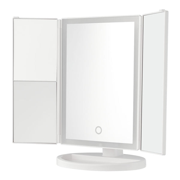 Dimension: Primary Mirror: 18cm W x 25.5cm H Mirror on the Right: 9cm W x 25.5cm H Base: 19cm W x 14.5cm D Material: ABS, Glass Colour: As Shown in the Picture Light Source: LED Strip Light Stepless Dimming: Yes Magnifying Mirrors Included: Yes Mount Type: Freestanding Power Source: USB, Batteries Batteries Type: AA Battery Number of Battery: 4 Batteries Included: No Package Contents: 1 x Vanity Mirror 1 x USB Cable