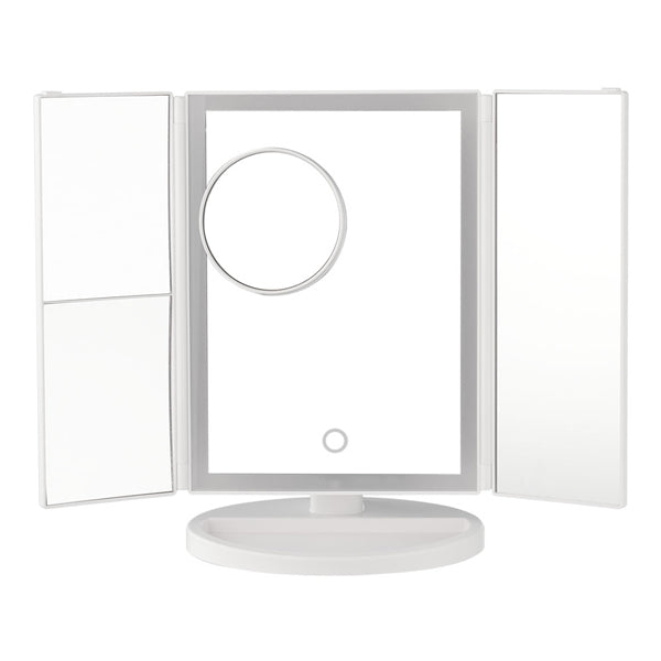 [Dimmable Touch Lighting] Adjust the brightness effortlessly for the ideal lighting during makeup or skincare routines. [180-Degree Rotation] Rotate the mirror up to 180 degrees for a detailed view from any angle. [Magnifying Mirrors] Equipped with two magnifying mirrors on the left side, plus a removable 10x magnifying mirror for detailed makeup application and skincare, ensuring precision with every use. [Dual Power Options] Choose between USB or battery power for convenience at home or on the go. Specifications: Dimension: Primary Mirror: 18cm W x 25.5cm H Mirror on the Right: 9cm W x 25.5cm H Removable Magnifying Mirror: 8.5cm Dia Base: 19cm W x 14.5cm D Material: ABS, Glass Colour: As Shown in the Picture Light Source: LED Strip Light Stepless Dimming: Yes Magnifying Mirrors Included: Yes Mount Type: Freestanding Power Source: USB, Batteries Batteries Type: AA Battery Number of Battery: 4 Batteries Included: No Package Contents: 1 x Vanity Mirror 1 x USB Cable