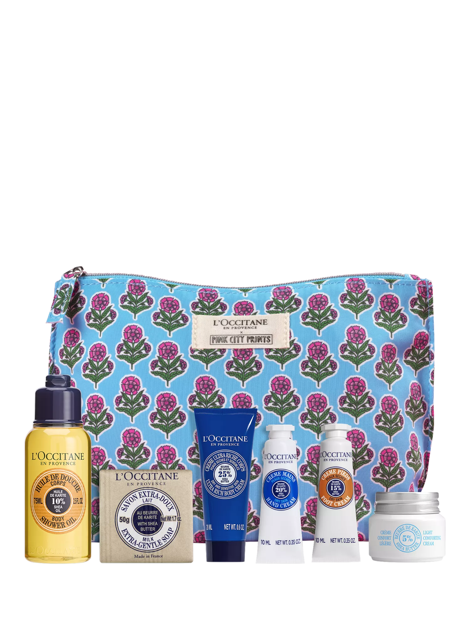 Indulge in luxurious shea butter pampering with this L'Occitane travel collection, beautifully packaged in a limited-edition Pink City Prints pouch. This set offers a delightful array of shea-infused products perfect for on-the-go skincare.