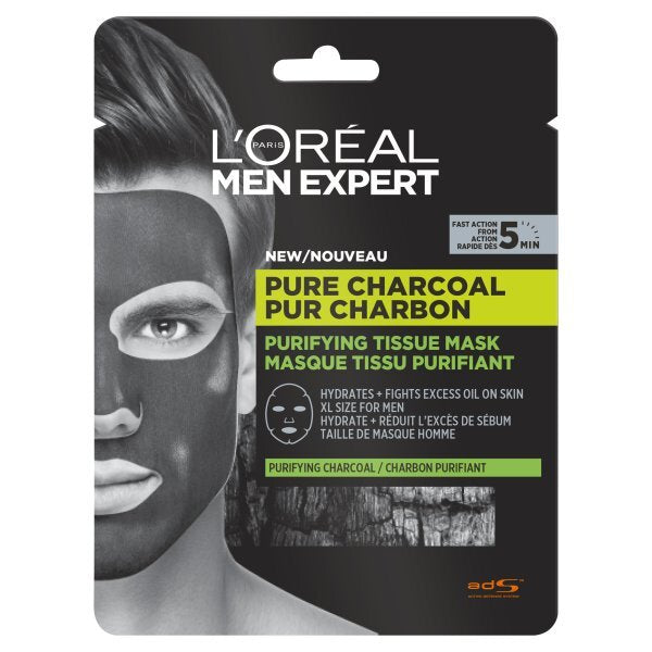 L'Oréal Men Expert Charcoal Tissue Face Sheet Mask provides rapid skin recovery for men in just five minutes. This single-use black tissue mask is specifically enriched with purifying charcoal and hydrating glycerin to address men's skin concerns effectively. It works to deeply moisturise while simultaneously mattifying the surface, helping to combat excess oil.