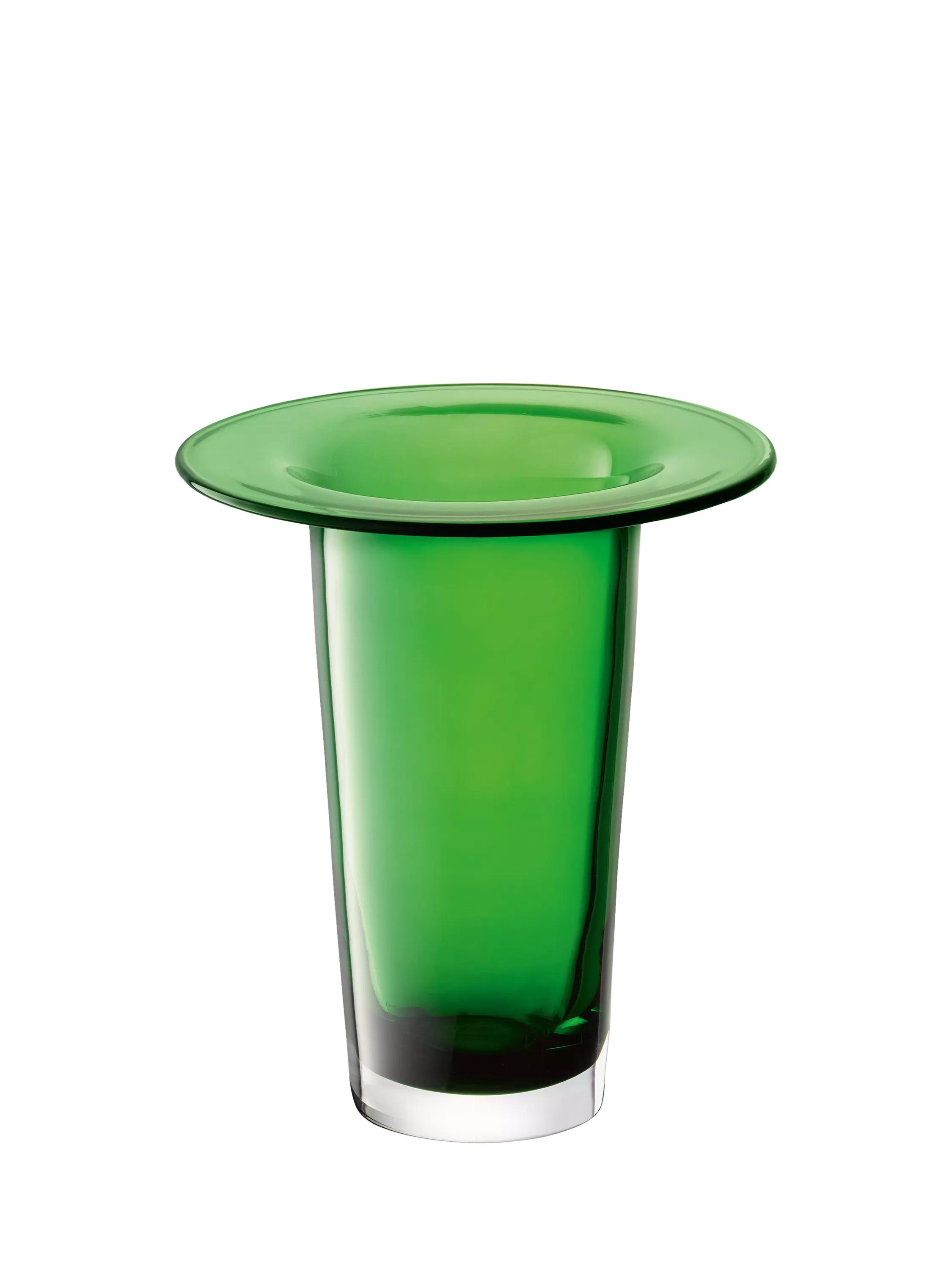 A mouth-blown vase or lantern with thick walls that fold outwards at the top into a wide and flat brim. Designed for seasonal displays, or a candle can be burned within.