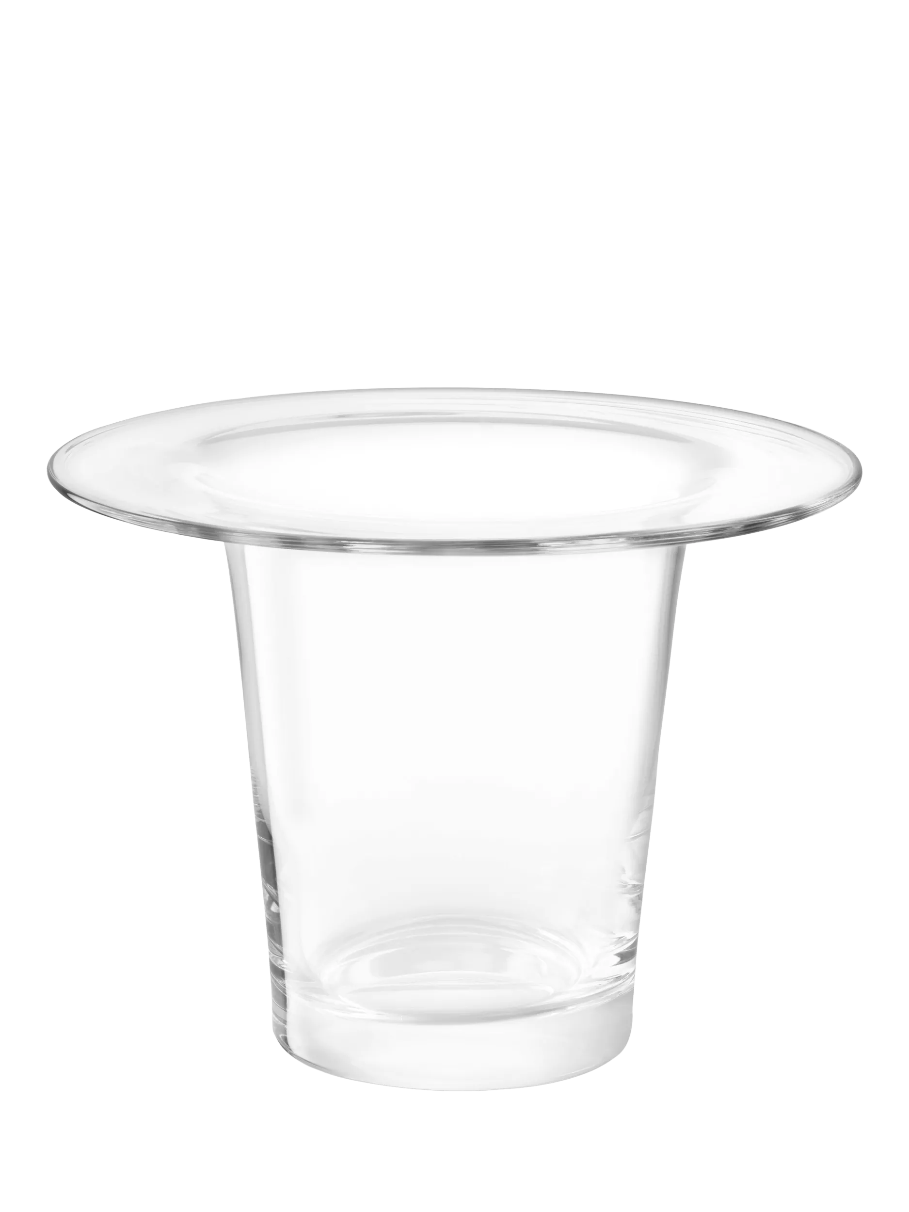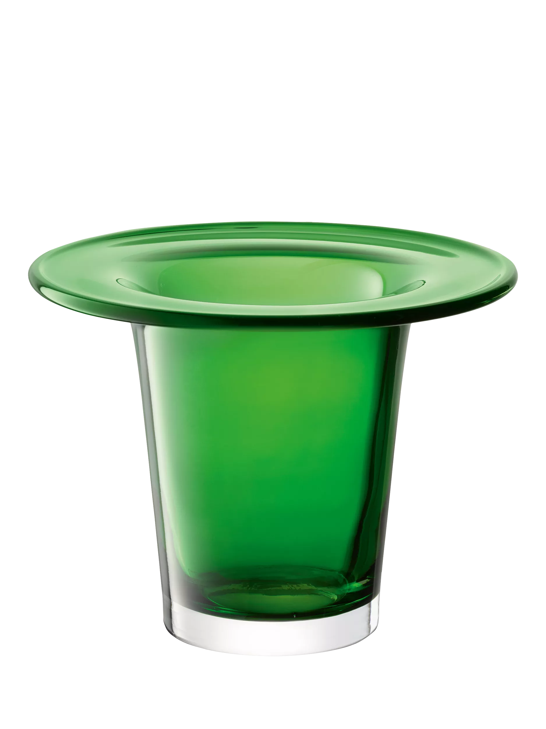 A mouth-blown vase or lantern, with thick walls that fold outwards at the top into a wide and flat brim. Designed for a handful of simple stems, or a candle can be burned within.