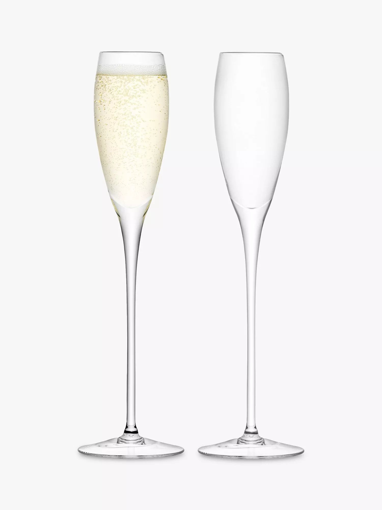 A pair of glass flutes, mouthblown by LSA International artisans. The narrow bowl helps to retain bubbles when enjoying sparkling wine, champagne and prosecco.