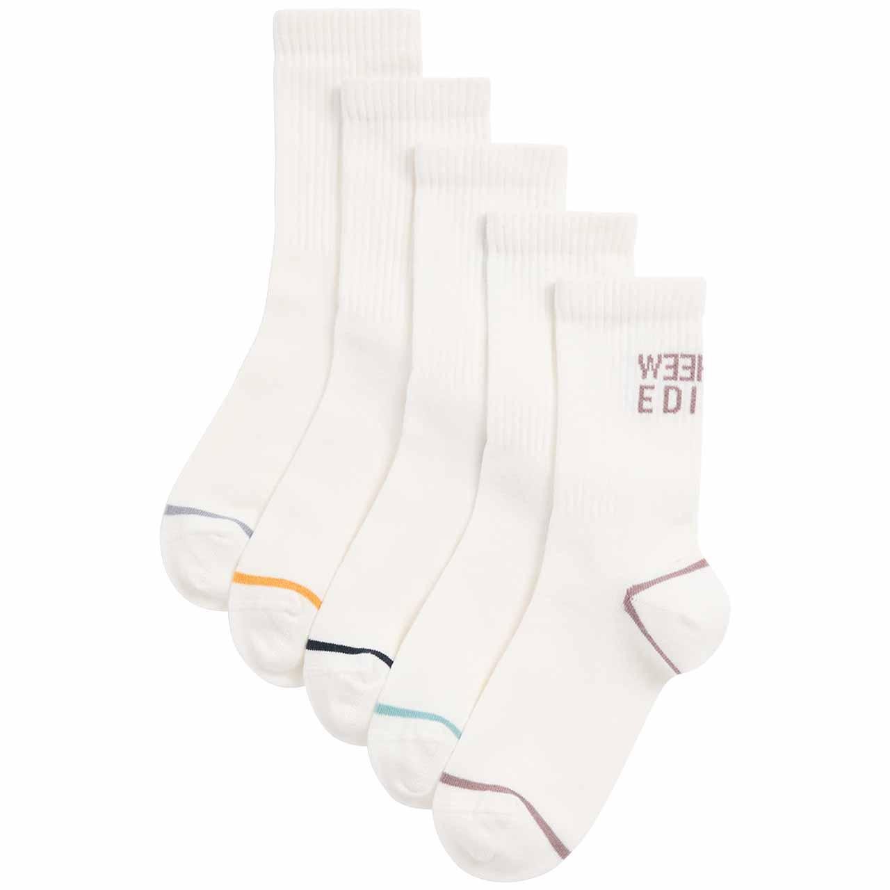 - Each pair includes a 'Weekend Edition' slogan visible on the ribbed cuffs.