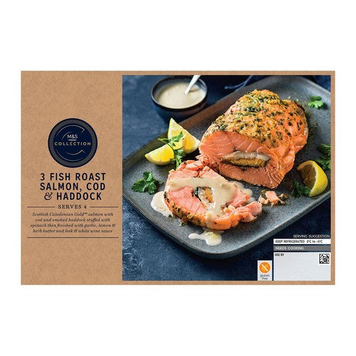 This M&S Collection item presents a delightful trio of quality fish prepared for convenience and flavour. It features Scottish salmon, smoked haddock, and cod combined into one expertly crafted roast format. This offering reflects the intricate attention to detail M&S strives for within its premium Collection line, ensuring a special result.