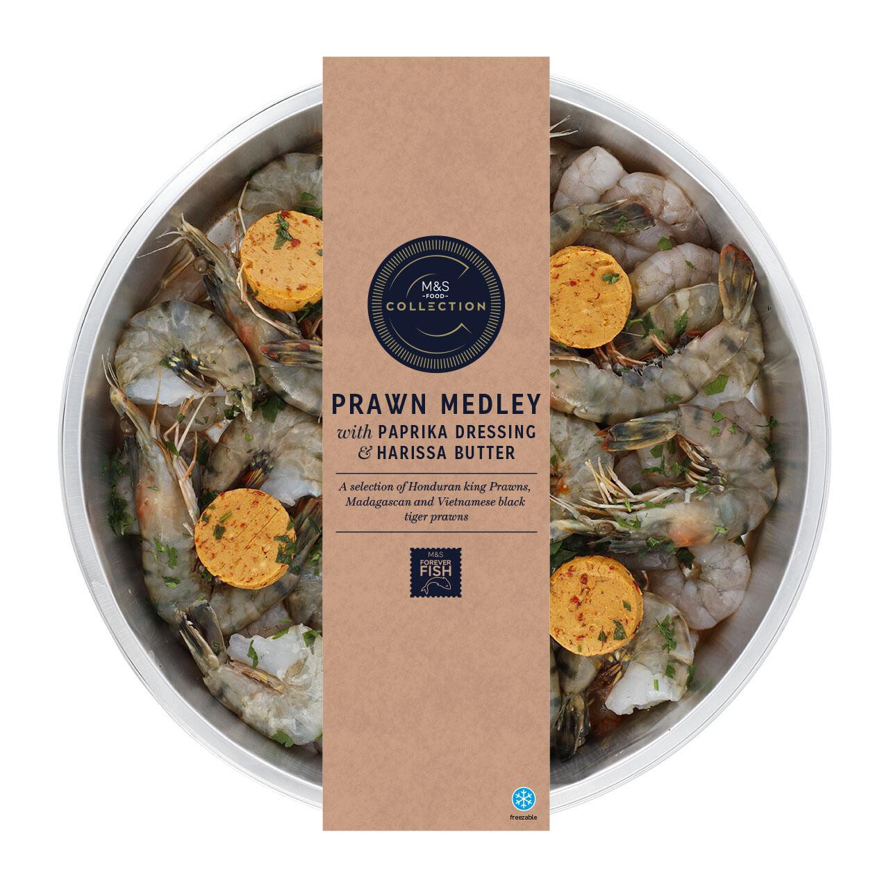 This M&S Collection Prawn Medley features a diverse selection of high-quality prawns ready for preparation. The medley combines Honduran king prawns with black tiger prawns sourced from Madagascar and Vietnam. It is enhanced with a rich, smoky paprika and garlic dressing. The butter component introduces the distinct flavour of Harissa for a gentle warmth. This prepared selection offers convenience for creating an elevated seafood dish quickly.