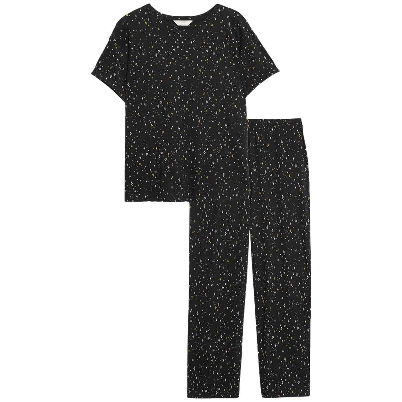 M&S Cotton Rich Printed Crop Leg Pyjama Set, L, Black