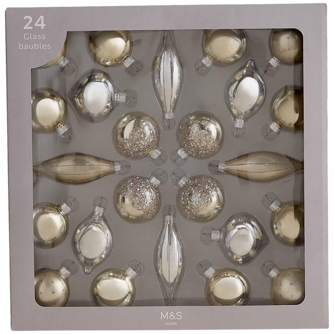 This collection of 24 silver glass decorations offers everything required to establish a stylish and coordinated look for your Christmas tree. The set combines various shapes and silver tones to create visual depth on your display. Customers will appreciate the thoughtful inclusion of multiple surface treatments across the collection.