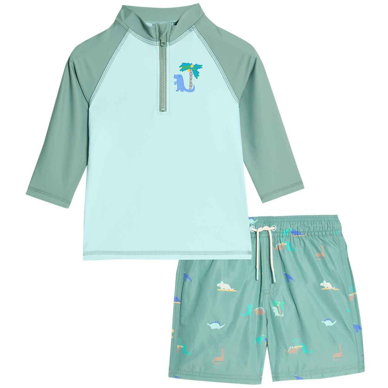 This two-piece set features a friendly dinosaur print for a playful look by M&S. Designed for comfort and ease of wear, both garments are tailored in a regular fit suitable for active play. The accompanying rash vest offers additional sun coverage during water activities. This practical design ensures children stay comfortable while swimming or playing near the water.