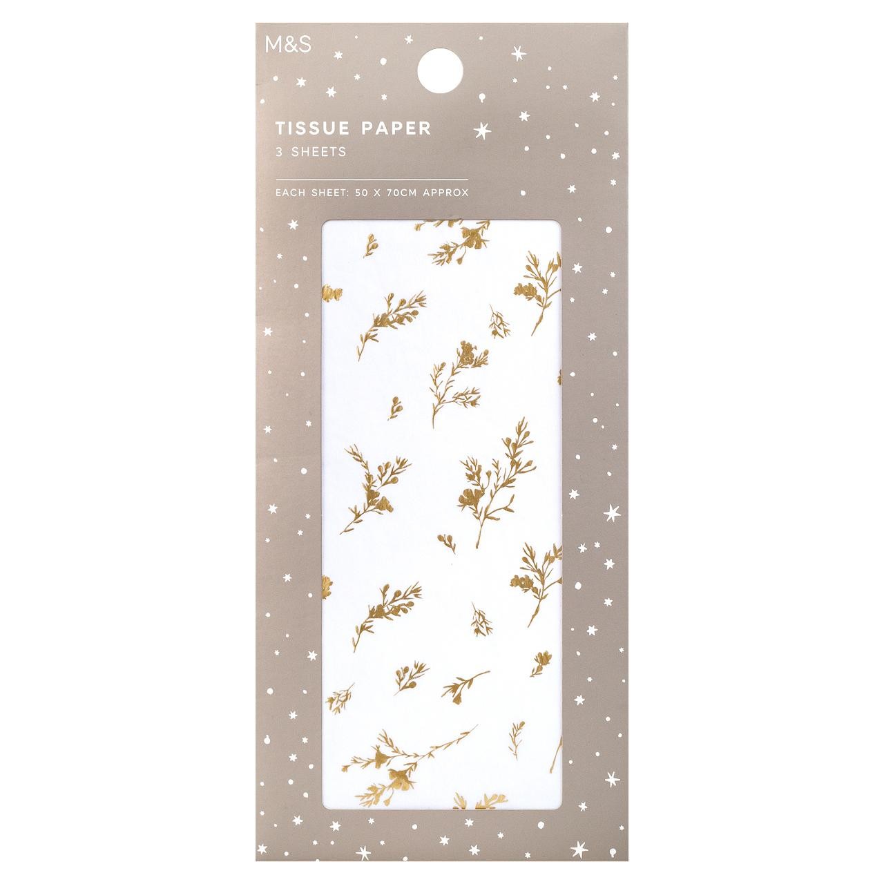 Add a touch of magic to your gift wrapping presentation with this M&S Enchanted Christmas tissue paper. Each pack includes three sheets featuring an elegant festive foliage design accented with gold foil detailing. This decorative paper offers versatile use for enhancing gifts of various sizes and presentations.