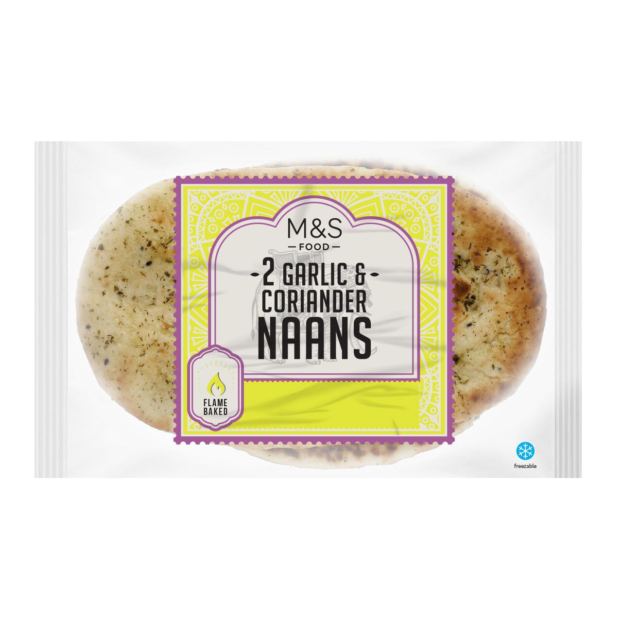These M&S Garlic & Coriander Naans are supplied in a convenient pack containing two individual flatbreads, ideal for complementing your favourite curry dishes. Featuring a distinctive flavour profile, these soft naans are flame-baked to achieve an authentic texture and superior finish. For maximum convenience, this product is also completely freezable.
