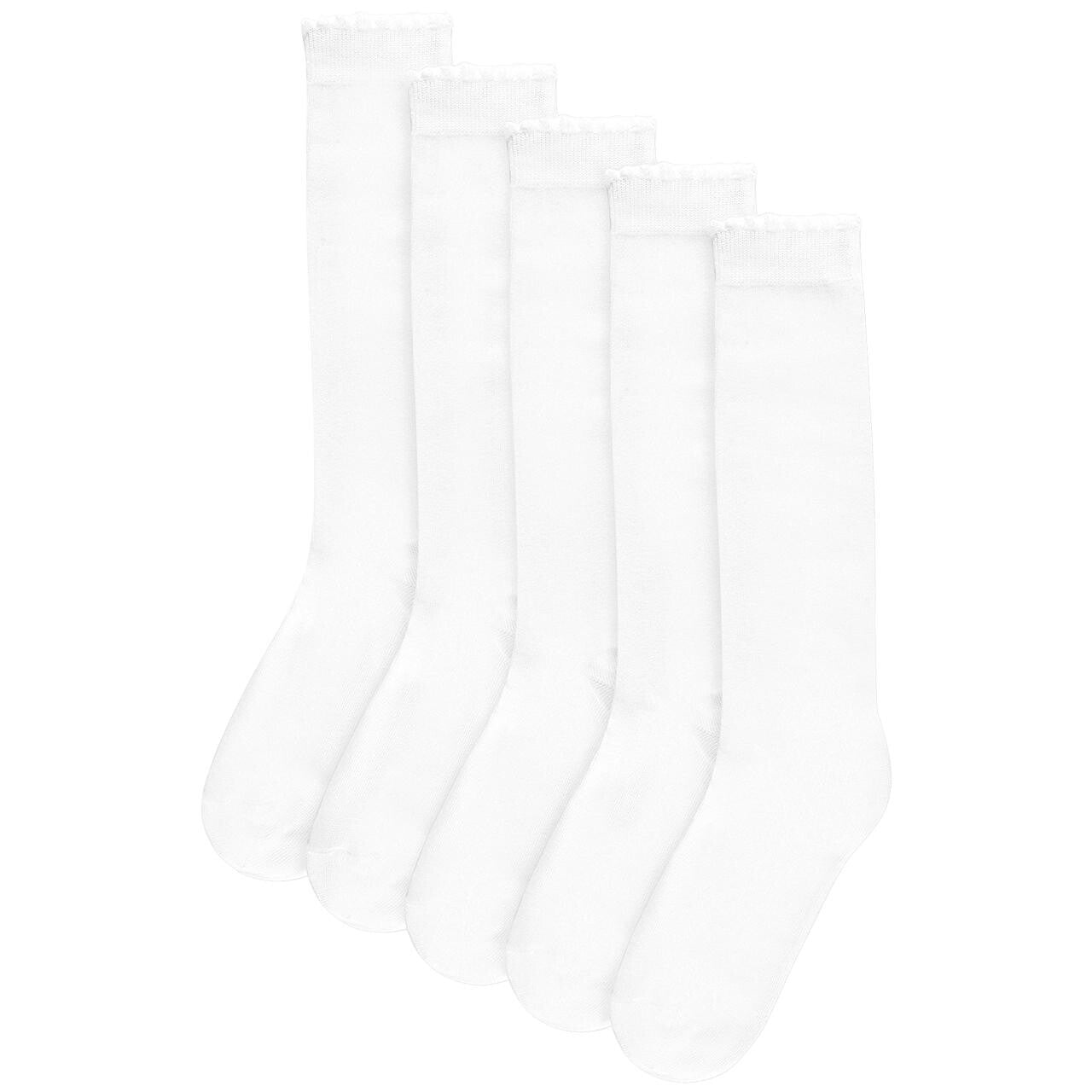 Stock up on school essentials with this five-pack of white knee high socks for girls. Designed for comfort throughout the day, these socks are made from a soft cotton mix fabric. They feature an attractive scalloped trim detail, adding a subtle touch of style to this practical item.