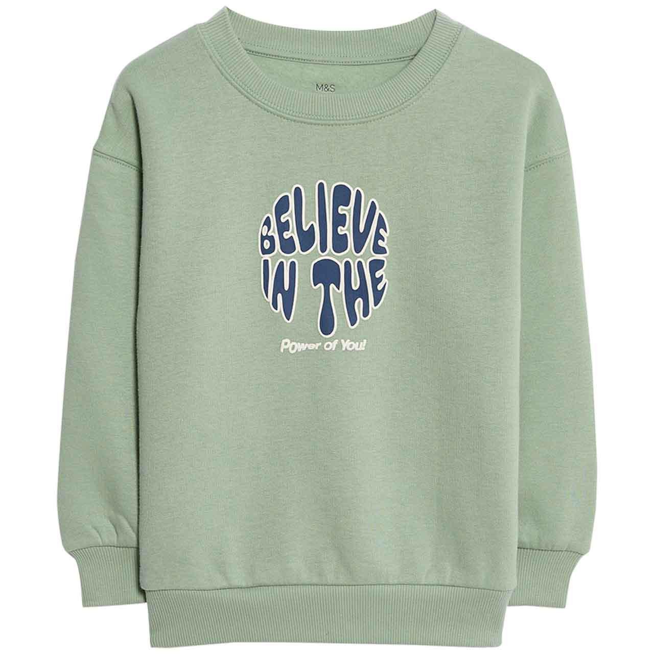 This M&S sweatshirt offers comfort and a positive message for younger children. Crafted from a cotton-rich blend, this pale green top is ideal for daily wear and active play. It is designed with a regular fit ensuring ease of movement throughout the day.