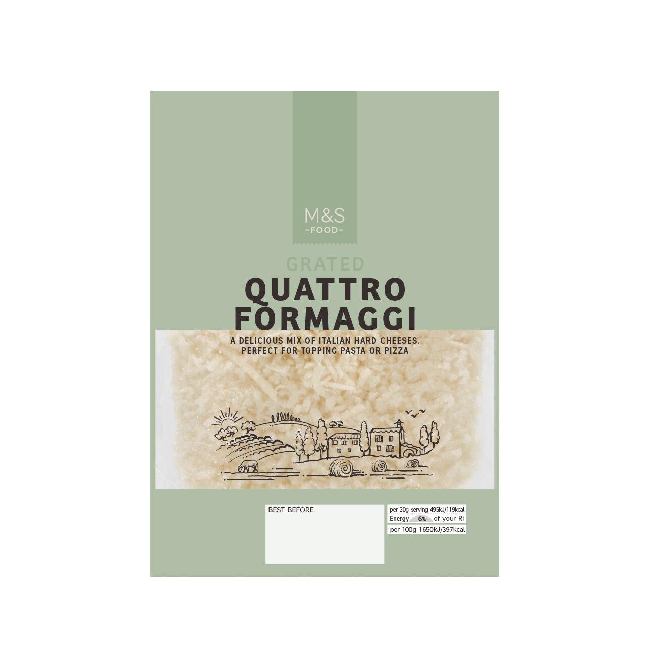 This M&S Grated Quattro Formaggi offers a rich, traditional blend of four authentic Italian hard cheeses. The convenient pre-grated format saves preparation time in the kitchen. Use this versatile topping to impart depth and flavour to various home-cooked meals instantly.