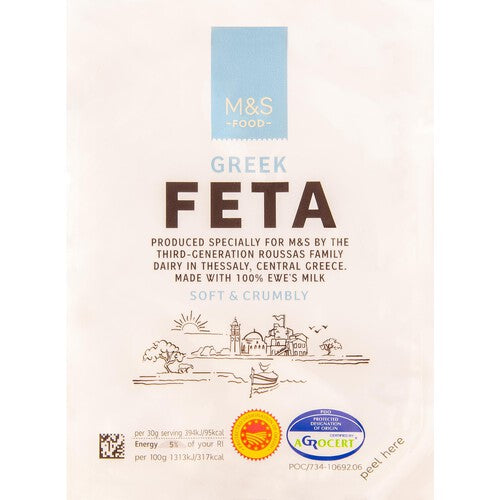 M&S Greek Feta is a soft, crumbly cheese originating from Thessaly, Greece. It is crafted entirely from 100% sheep’s milk, resulting in a distinctly fuller and stronger flavour profile for culinary use.