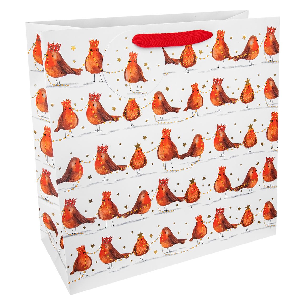 Present your gifts with seasonal charm using this large square M&S Christmas gift bag. It features delightful illustrations of robins interacting with festive Christmas lights against a stylish background. This bag offers a convenient and attractive way to wrap presents for loved ones during the holiday season.