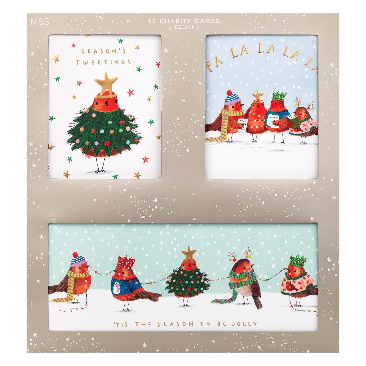 Send warm festive greetings using this pack of 15 M&S Charity Christmas cards that showcase three distinct, charming robin designs. These high-quality cards are printed on sturdy board, offering a premium feel for all your seasonal messages. Your purchase helps M&S donate funds to their valued charitable partners during the holiday season.