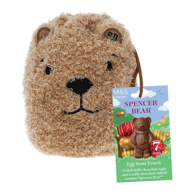 A fabric bag containing 6 foiled hollow milk chocolate eggs and a Spencer Bear - soft milk chocolate shape with a salted caramel centre