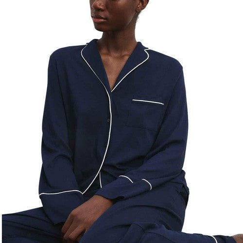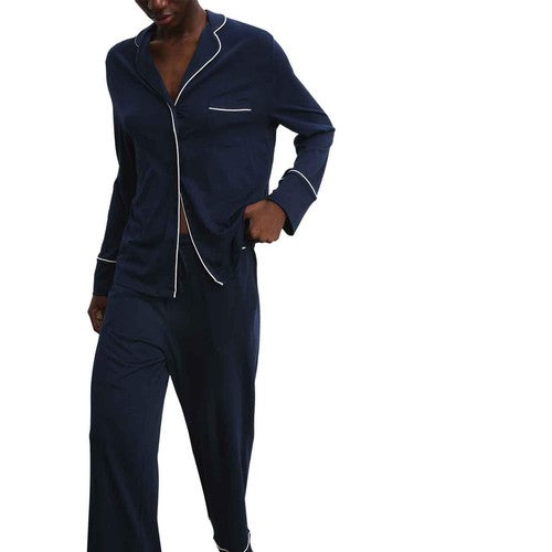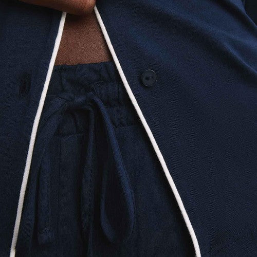 - The button-through top features a relaxed revere collar and contrasting piped trims.