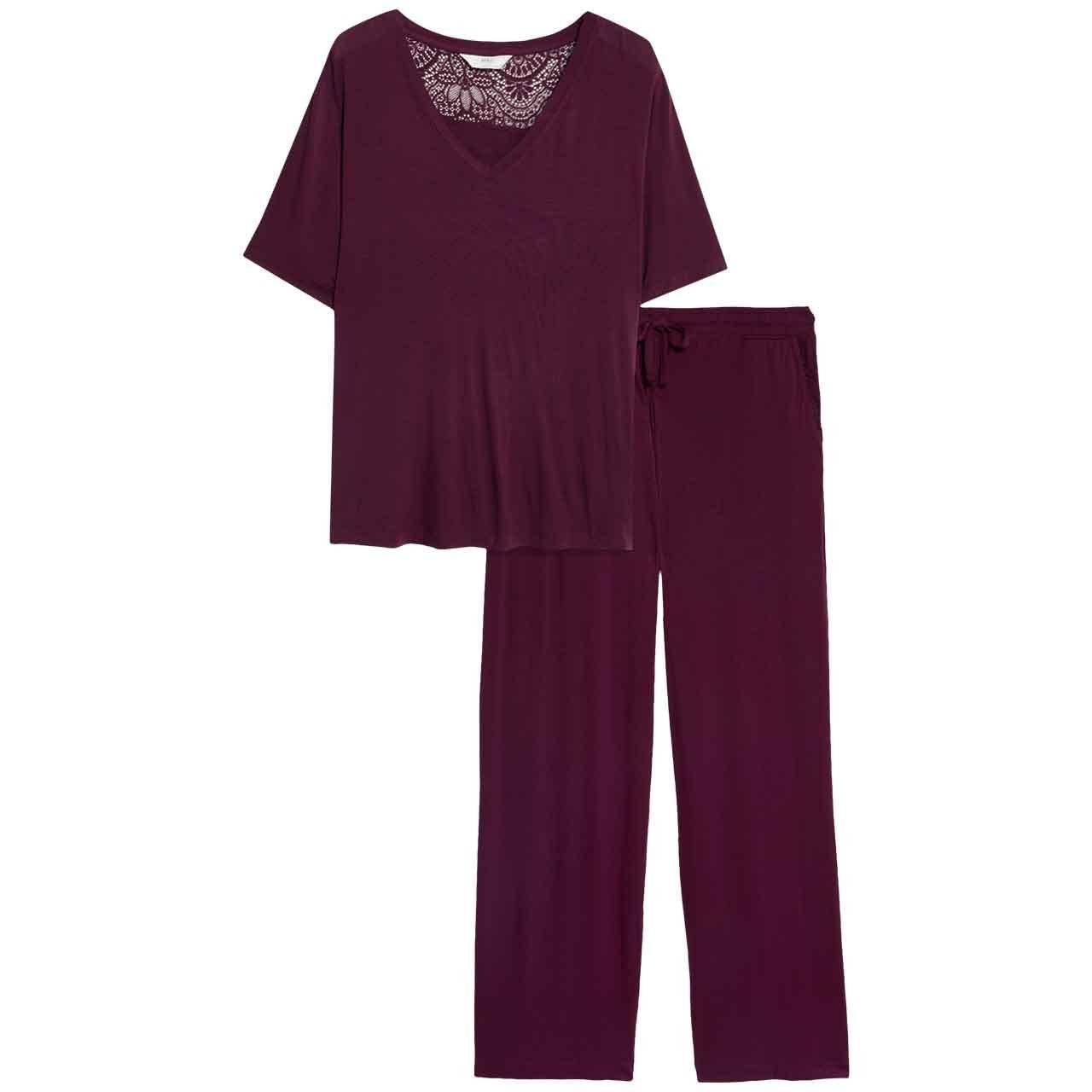 M&S Womens Viscose Lace Pyjama Set, S, Dark Magenta