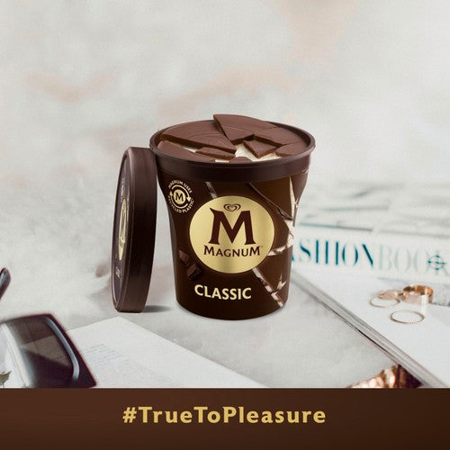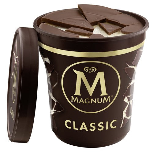 Experience the signature Magnum indulgence in a convenient tub format. This product features thick, cracking chocolate surrounding velvety dairy vanilla ice cream. Enjoy the satisfying textural contrast designed for deep flavour enjoyment.