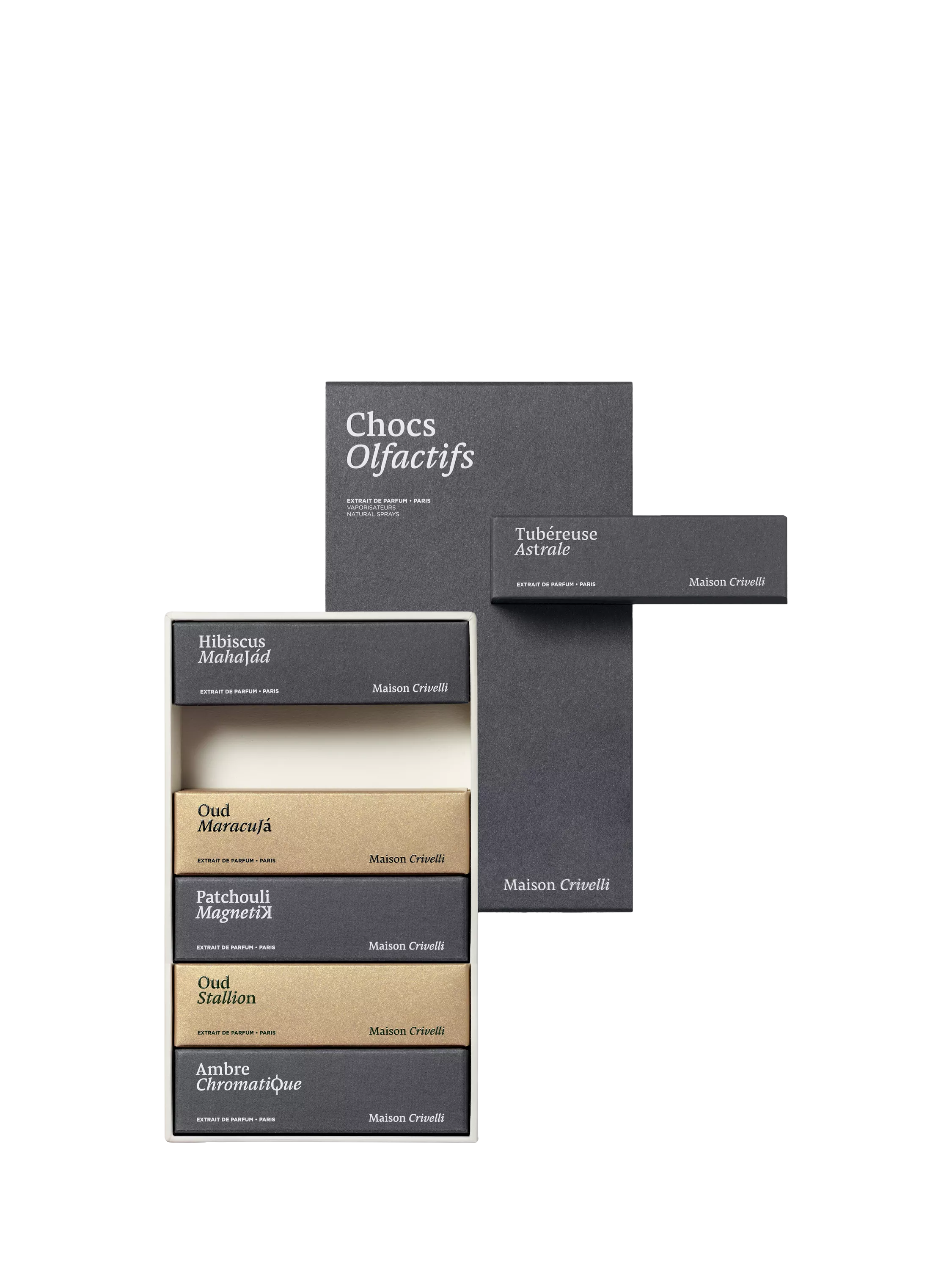 Our six extraits de parfum are now available in a new set, which includes a bottle of Tubéreuse Astrale, Hibiscus Mahajád, Patchouli MagnetiK, Ambre Chromatique, Oud Maracujá and Oud Stallion.