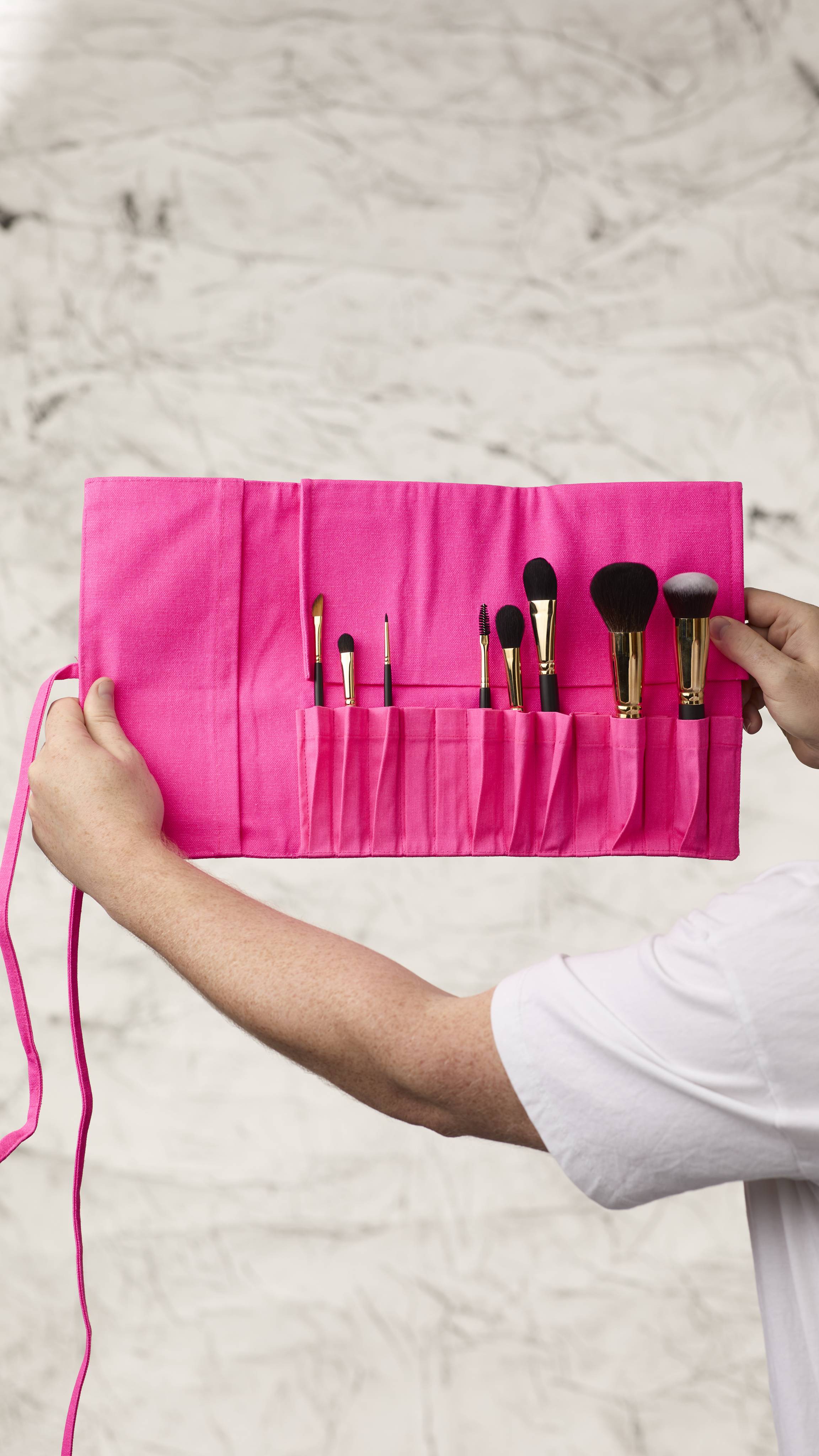 Keep your makeup brushes organized and protected with this stylish fluoro pink brush wrap. Perfect for professional makeup artists and beauty enthusiasts alike, this wrap offers convenient storage and transport for all your essential tools. It's sustainably made, supporting ethical practices.