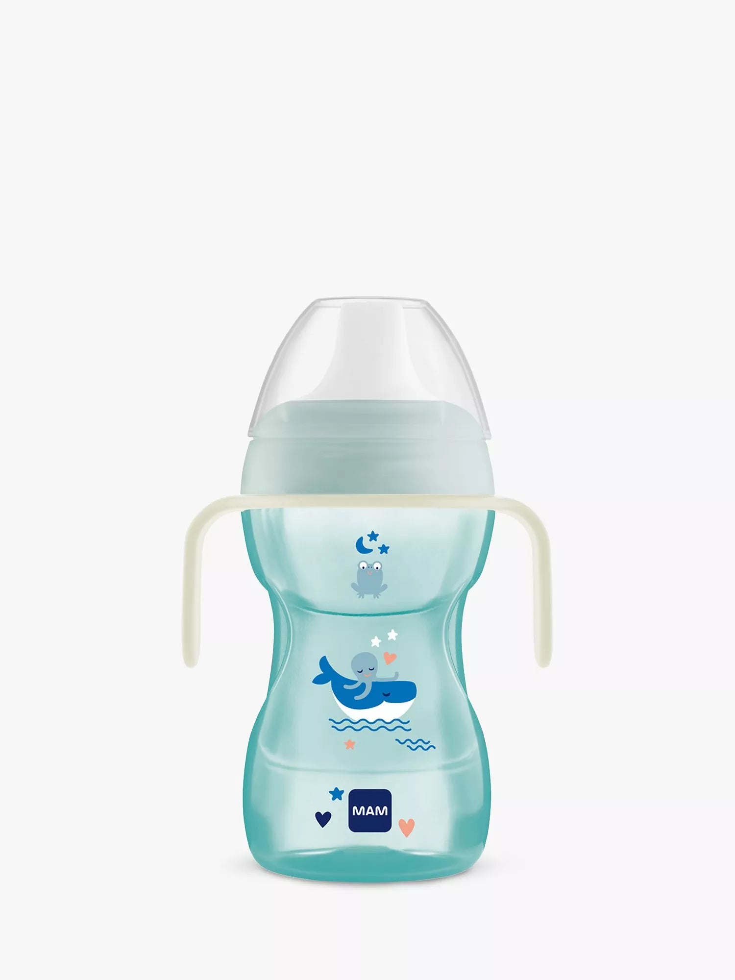 Choose between a non-spill cup or a free-flow cup by simply adding or removing the clear valve; this also allows for easy and complete cleaning. The ergonomic non-slip glow in the dark handles make it easy and comfortable for baby's small hands to hold, with the added benefit of parents having no problem finding the cup at night and disturbing their little one. The cup features cute nighttime motifs, perfect for a pre-bedtime feed.