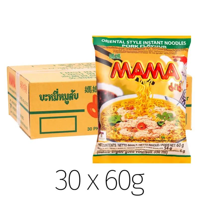 Mama is Thailand's leading producer of instant noodles. Mama\u2019s Pork Flavour Noodles are a packet of instant noodles served with a spicy and slightly smokey broth that is full of slightly sweet pork flavour. This delicious noodle soup is sure to satisfy your hunger and tease your taste buds. These instant noodles are quick and easy to prepare. Simply add boiling water, wait a few minutes, and enjoy.