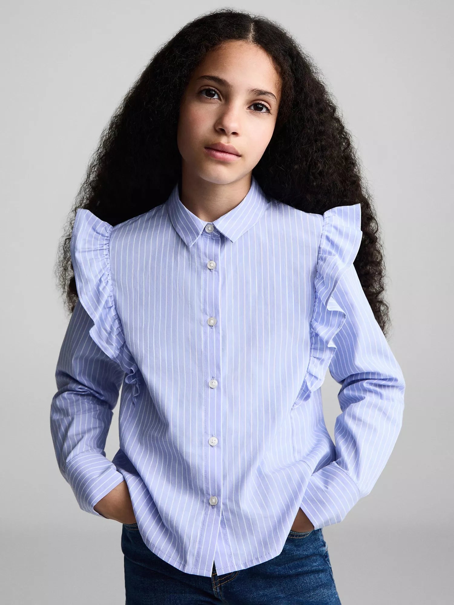 This smart blouse is crafted from soft cotton with ruffle detail around the shoulders. Great for smarter days, it's cut to a straight fit with long sleeves, buttoned cuffs and a simple front button closure.