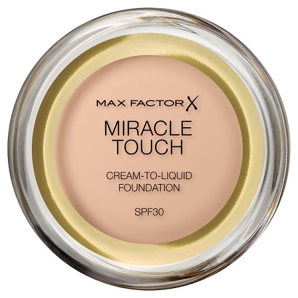 the unique max factor miracle touch foundation now upgraded with hyaluronnic acid and spf 30 its solidtoliquid formula floats over skin texture for an instantly perfected smoother look